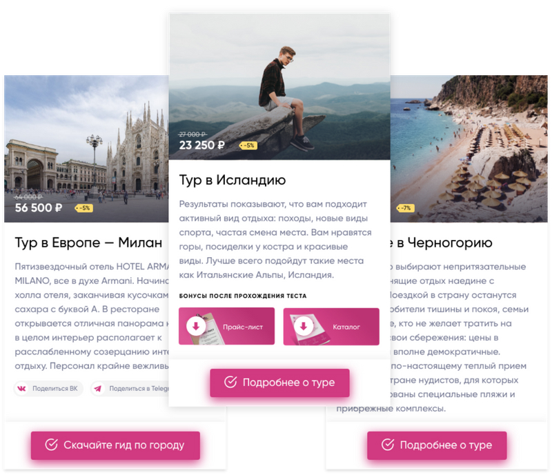 - квизы — идеальный формат мягкого прогрева: человек отвечает на вопросы и сам приходит к решению.