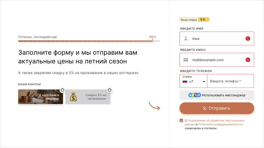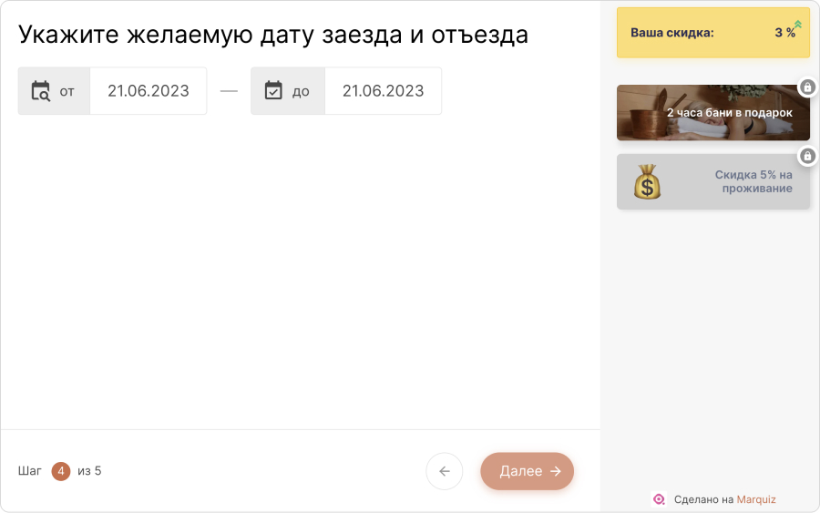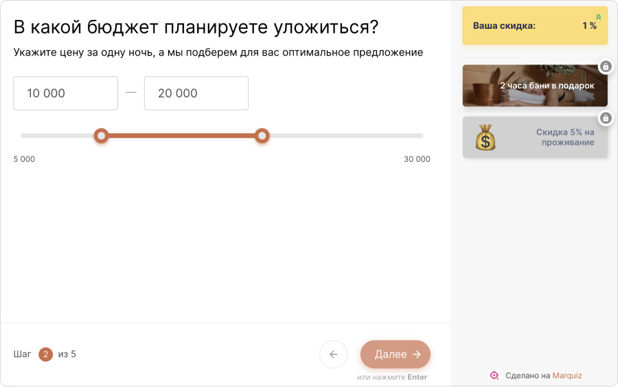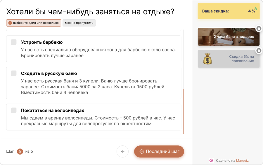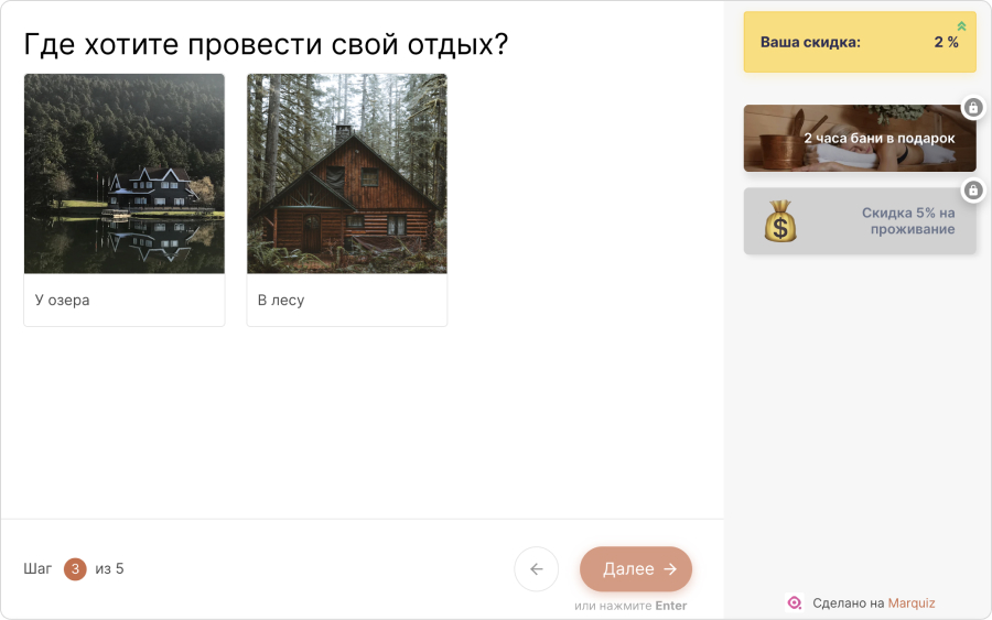 В квизе человек видит подходящий для себя вариант аренды большого дома, ещё и со скидкой