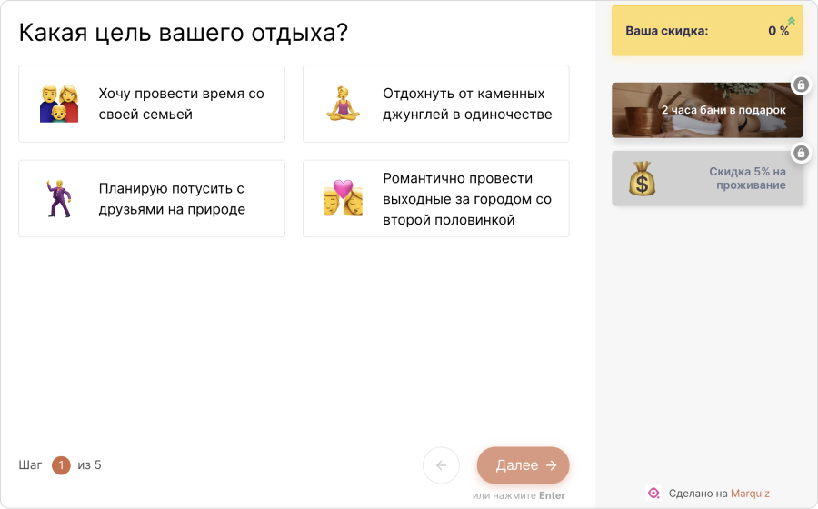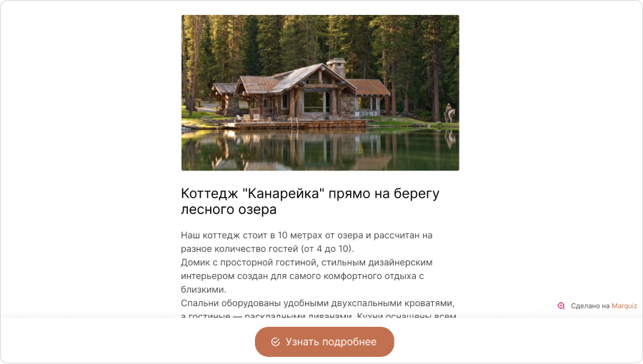 Возьмём для примера компанию по аренде загородных домов. Рассмотрим, как один только квиз может рассказать об этой услуге.