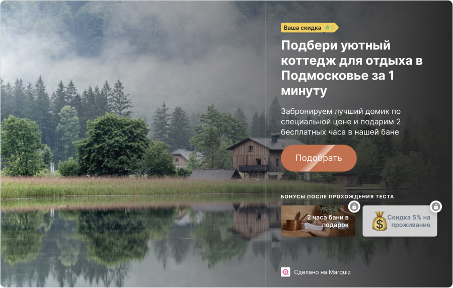 Квиз начинается со стартовой страницы, пользователь сразу узнаёт, что может получить скидку и подарок за аренду дома в живописном месте